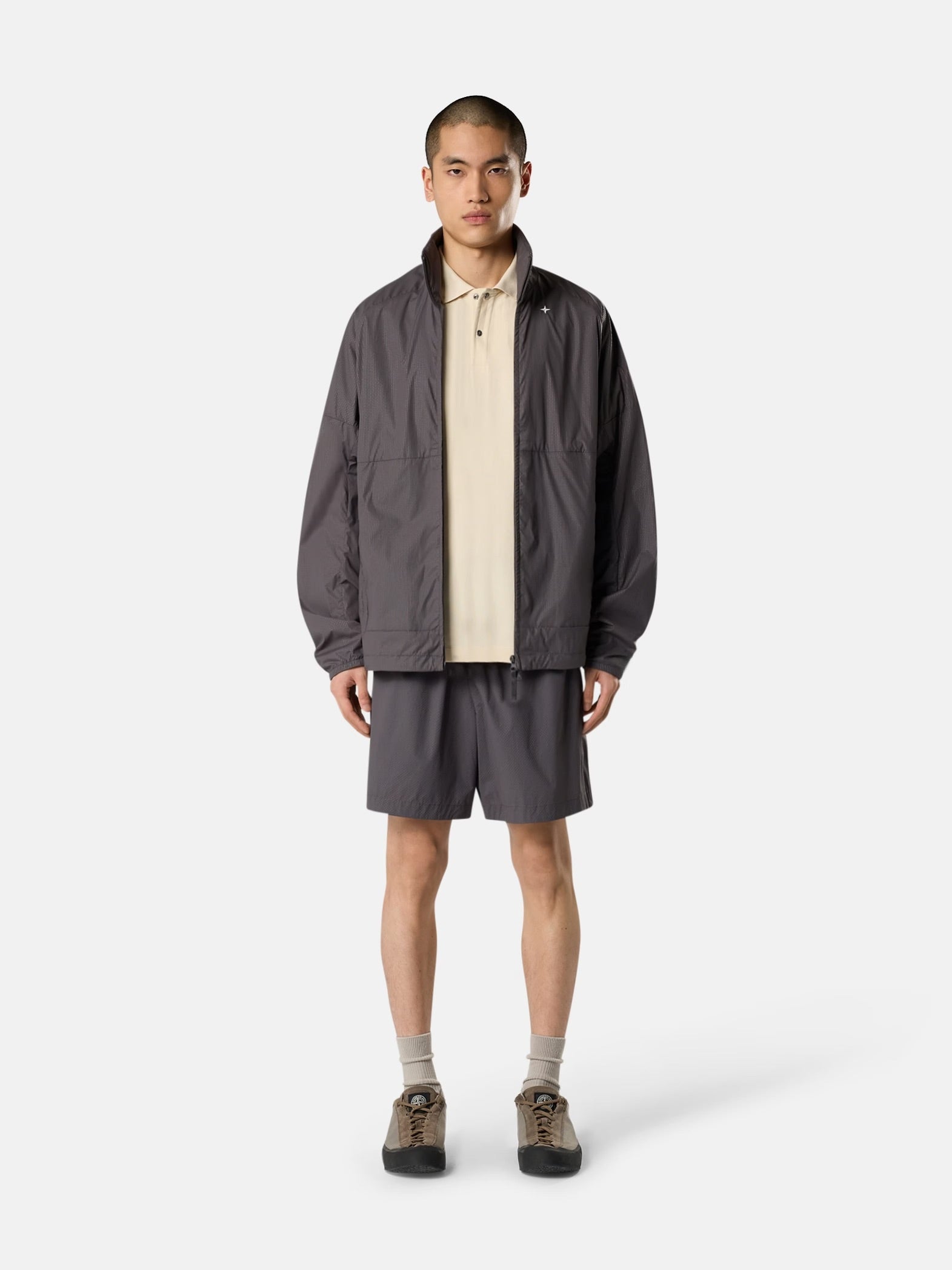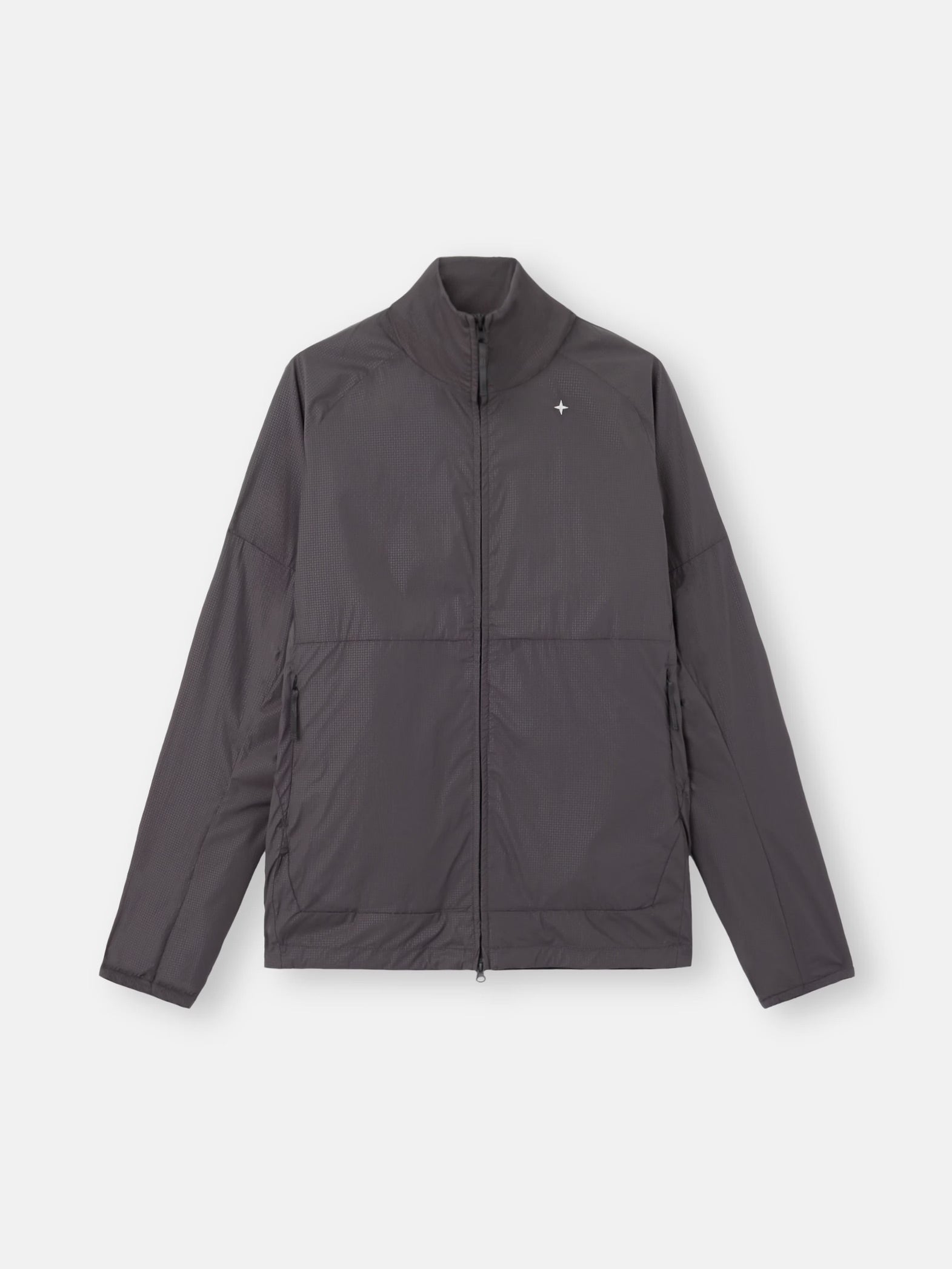 Allover-Mikromotiv. Stehkragen. Stickerei mit Stone Island Star auf der Brust. Passe vorn und hinten mit Raglanärmeln. Vertikale Seitentaschen mit nicht sichtbarem Reißverschluss. Elastische Bündchen. Elastischer Kordelzug mit Stoppern am Saum. Verdeckter Zwei-Wege-Reißverschluss.