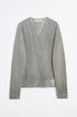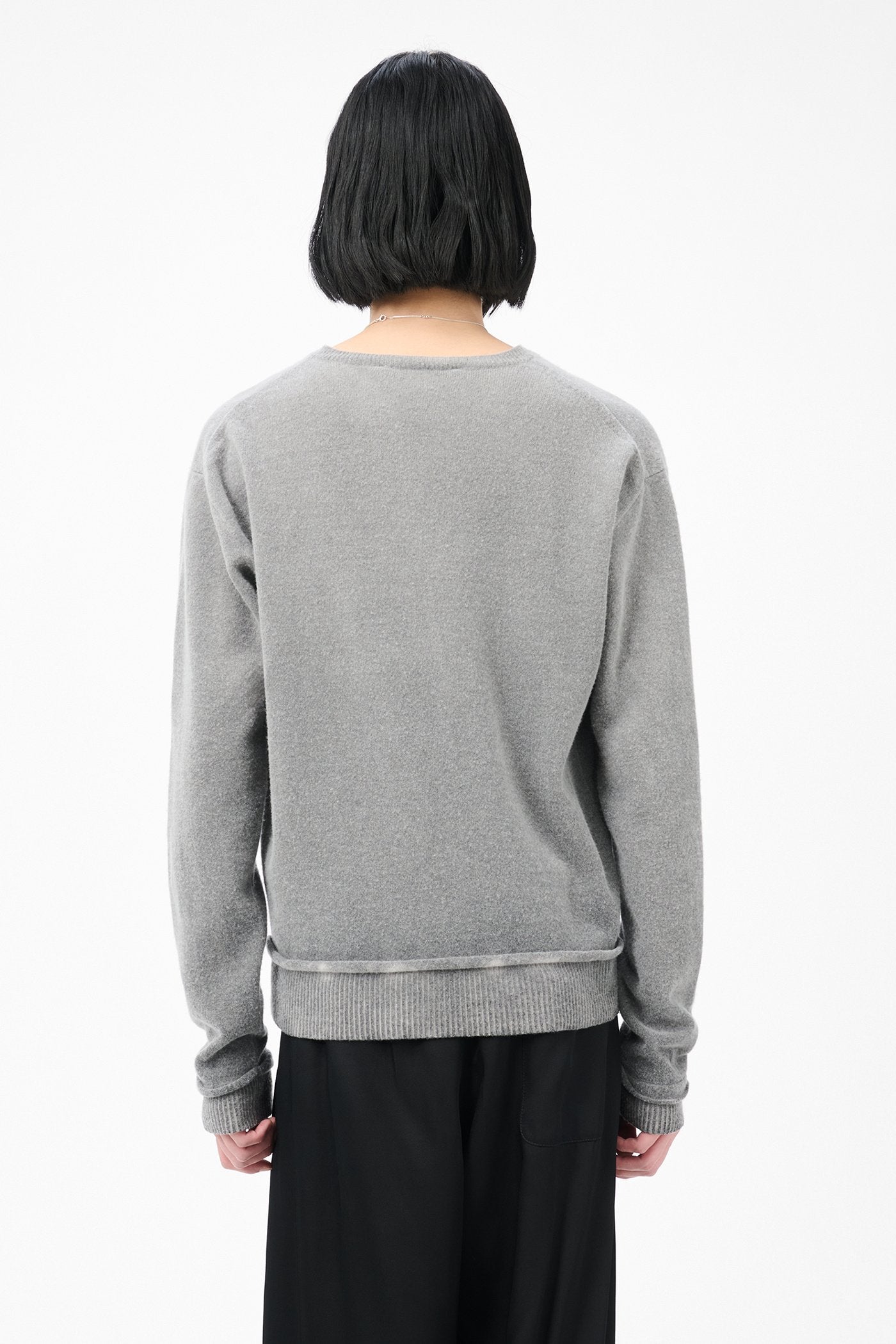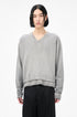 The men's Parallel V-Neck is crafted from Italian merino wool and features a relaxed fit with dropped shoulders. It's treated with a cold-spray dye that highlights the yarn's surface details and provides a soft texture. The design includes a ribbed V-neck, ribbed hem and cuffs, and topstitched hems with rolled edges for a raw, casual look.
