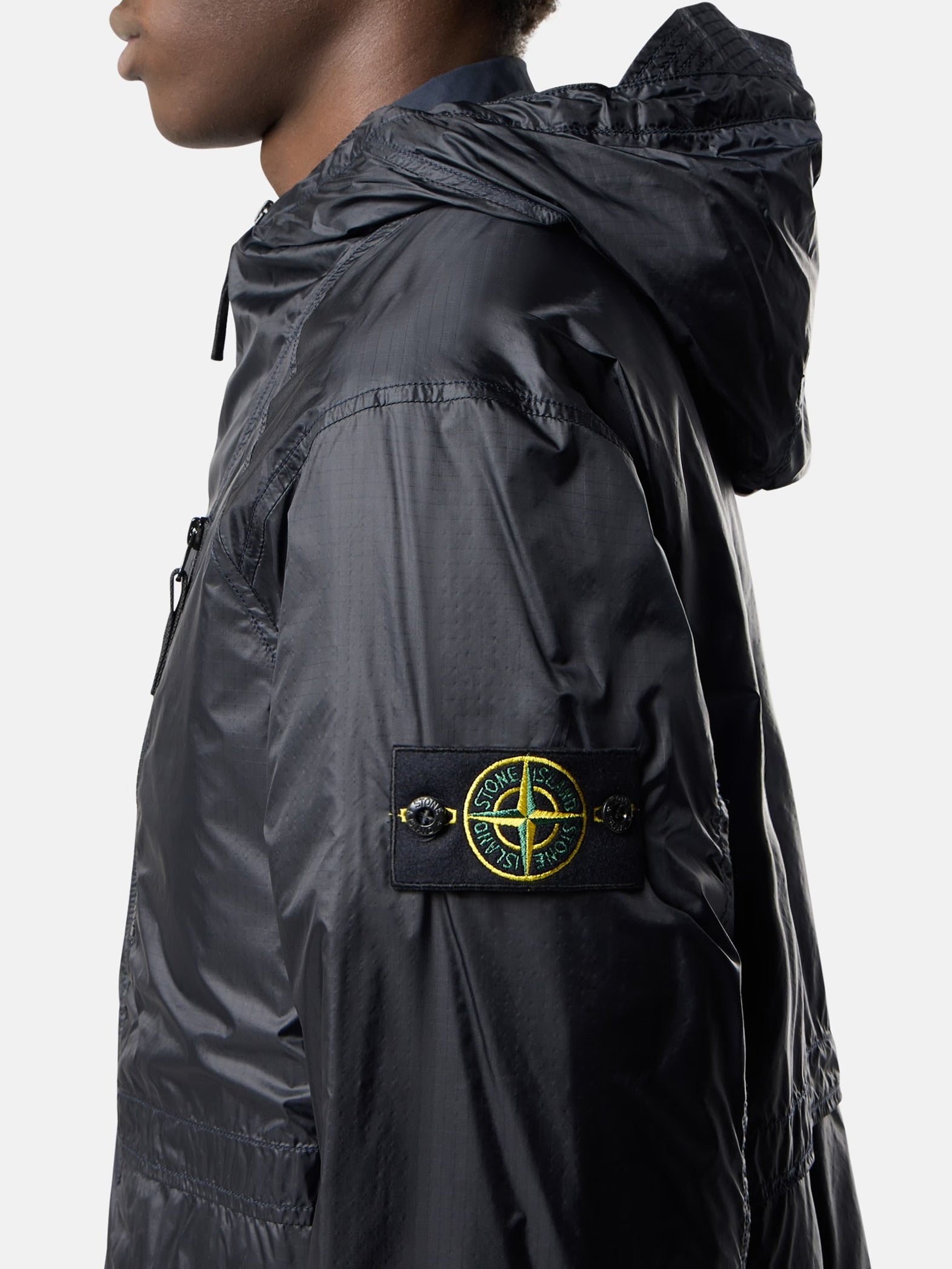 Kapuze mit Schirm und elastischem Kordelzug an der Außenkante und der Rückseite. Geformte Passe vorn mit Raglanärmeln. Schräge Brusttaschen mit Reißverschluss. Blasebalg-Seitentaschen mit Klappe und verdecktem, doppeltem Druckknopf. Schlitze auf der Rückseite. Stone Island Badge auf dem linken Ärmel. Elastische Bündchen. Elastischer Kordelzug am Saum. Zwei-Wege-Reißverschluss.